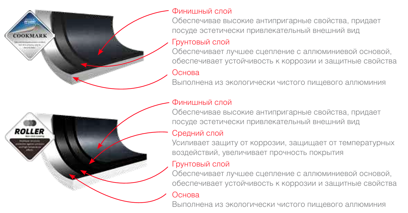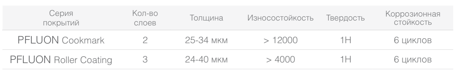 Антипригарные покрытия серии COOKMARK обладают отличными антипригарными свойствами, устойчивостью к химическим и абразивным воздействиям. А накатные покрытия серии ROLLER COATING обладают многослойной структурой, что обеспечивает усиленную стойкость к коррозии и защищает посуду от деформации при воздействии высоких температур.